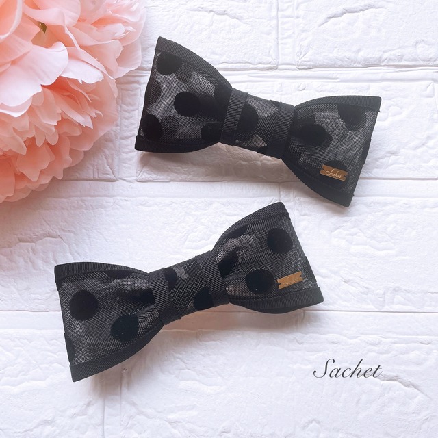✿ドット柄ファブリックリボンシリーズ✿ 〜メッシュ✖︎ドットフロッキー〜 広幅スクエアリボンのバレッタ
