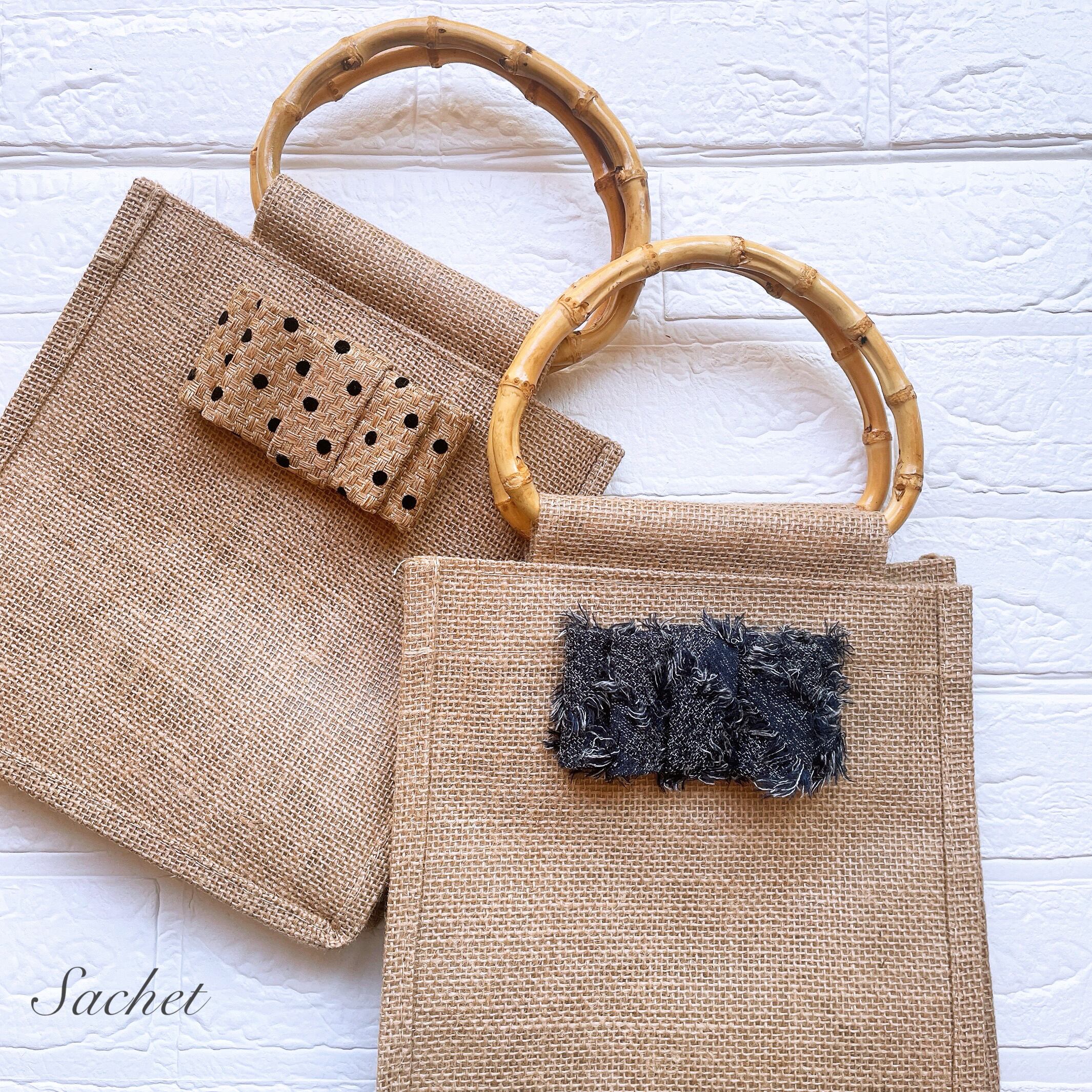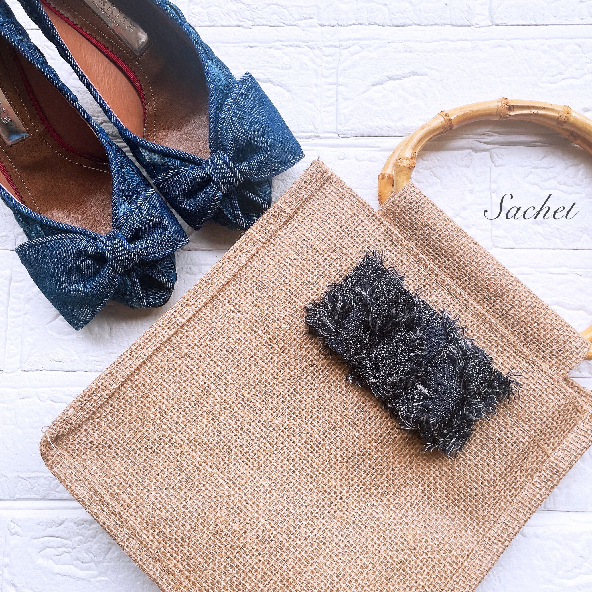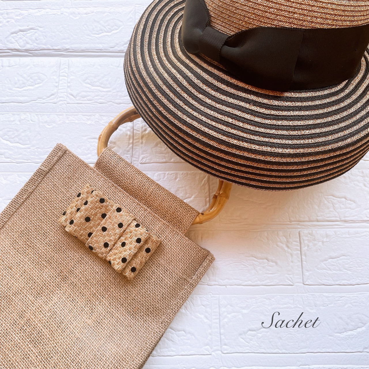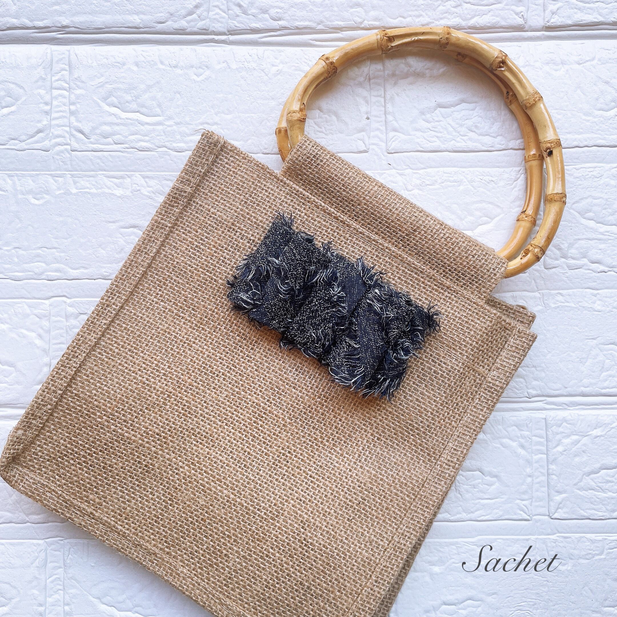 バンブーハンドルがポイントのジュートバッグにリボンをアレンジ。