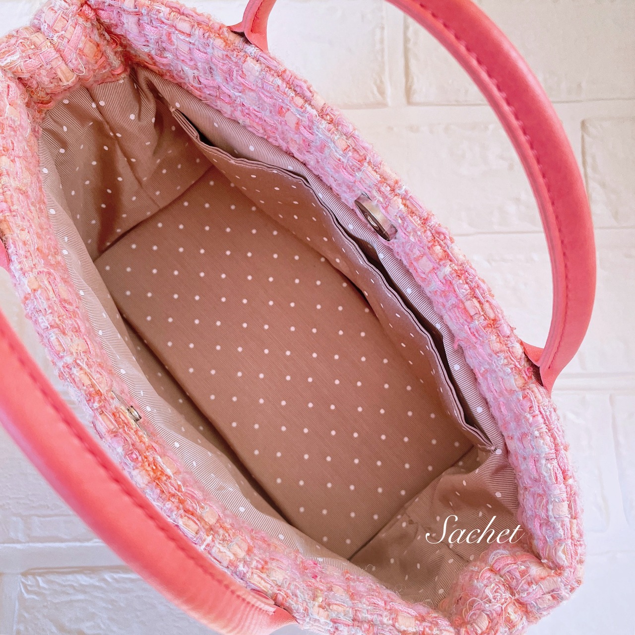 絶妙なトーンのピンクの糸が織り込んであり、可愛さに加えてオシャレさのある素材のバッグです。