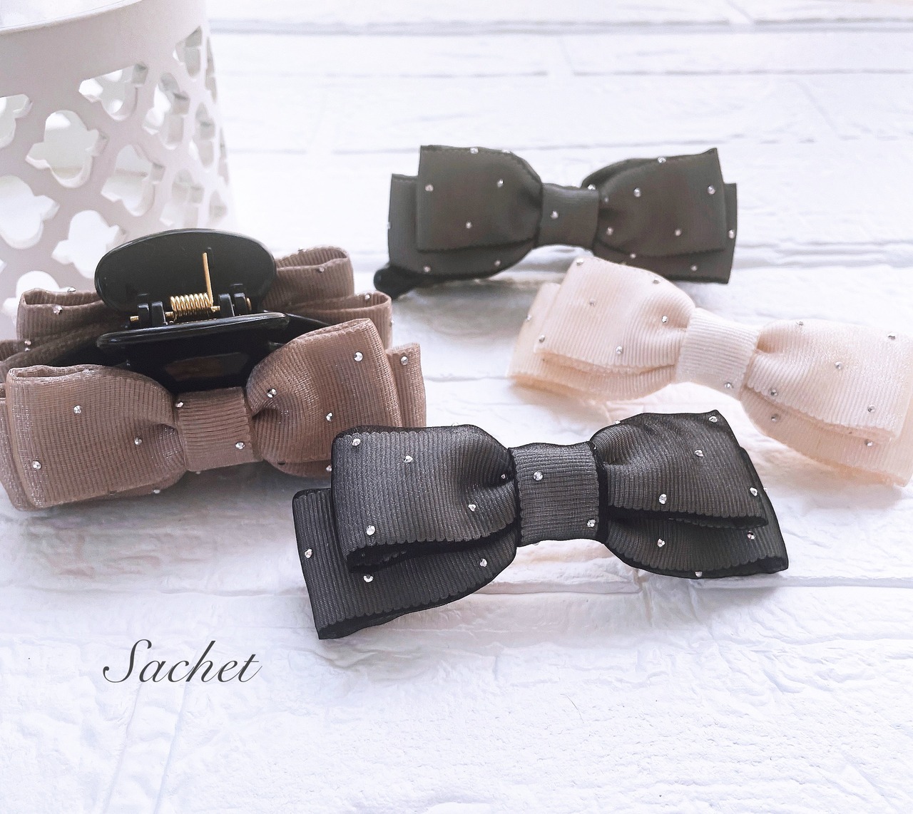 オーガンジー素材の軽やかさとシルバードットの可愛らしさが融合したダブルリボンバレッタは、ヘアアレンジにアクセントをプラスしてくれるアイテムです。